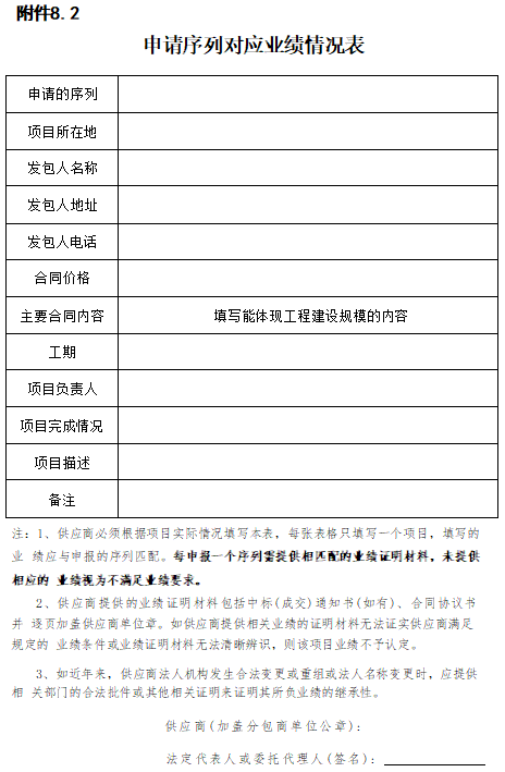 7.供應(yīng)商申請序列對應(yīng)業(yè)績情況表(格式見附件8.2);