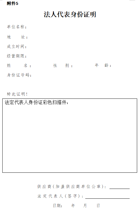 3.供應(yīng)商法人代表身份證明(格式見附件5);